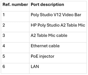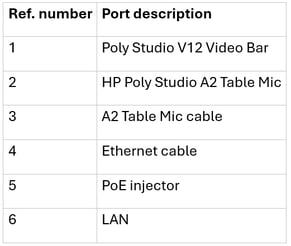 To use a HP Poly Studio V12 Table Mic with a Poly Studio V12, connect a single HP Poly Studio V12 Table Mic directly into the Poly Studio V12. You don't need an A2 Audio Bridge. Only one HP Poly Studio V12 Table Mic is supported on a Poly Studio V12.